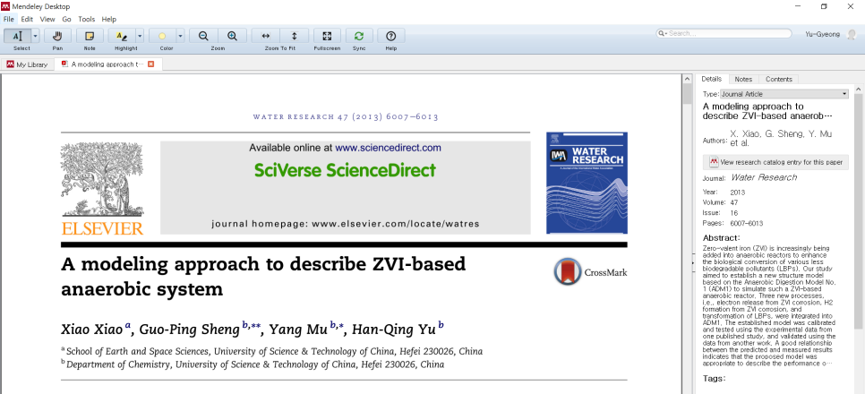 항목을 더블클릭하면 아래처럼 Medeley 프로그램에서 논문을 바로 읽을 수 있고 특정 문장을 하이라이트하거나 노트를 남길 수 있습니다. 논문을 인쇄해서 읽어도 좋지만 Mendeley를 통해서 읽으면 중요 부분을 표시하고 기록해둘 수 있습니다. 읽어야하는 논문이 많은 사람에겐 참 편리하죠.