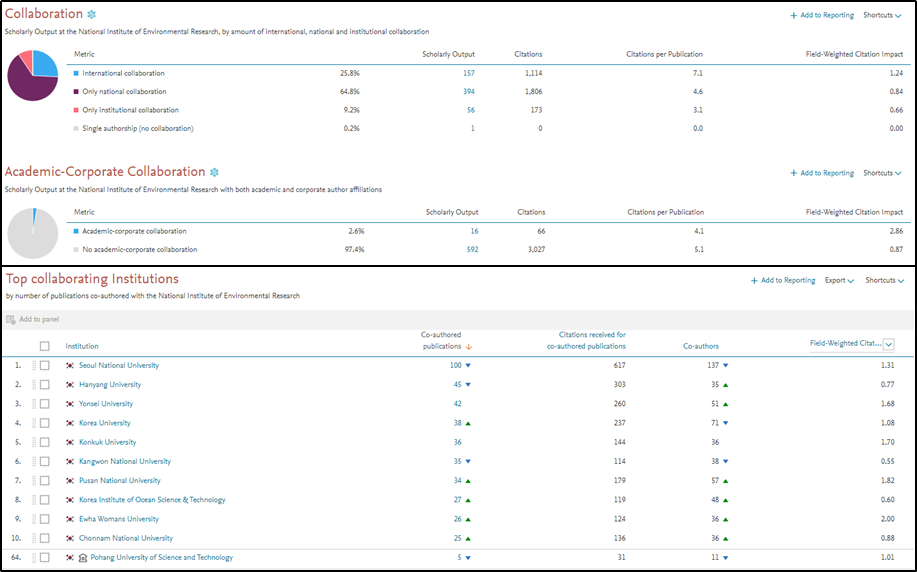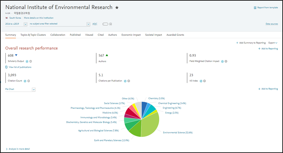 국립환경과학원의 성과를 예를 들어 검색해본 결과, 전체 출판물 수, 인용 횟수, 출판물 당 인용 횟수, 기간 내 논문 저자 수를 확인할 수 있었다. Field-Weighted Citation impact 이란 SCOPUS 데이터베이스의 연구 주제 분야, 출판물 종류를 고려해 전 세계 평균이 1이 되도록 normalize 한 인용 지수이다(c.f. 0.93 = 평균보다 7% 덜 인용됨).