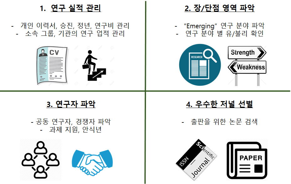 Bibliometric analysis 기술은 개인 이력서, 승진, 정년, 연구비 등을 관리하는 데 사용하기 용이하며 각 기관의 업적을 담당하는 업무를 수행한다면 필수적으로 익혀야 하는 기술이다. 또한, emerging 분야, 즉 새롭게 연구되는 분야를 파악하고 각 연구 분야 별 장/단점을 파악하여 논문 작성 및 과제 수행을 위해 적합한 연구 분야를 선정하는 데 도움이 된다. 마지막으로 같은 과제에 지원하는 경쟁자의 정보를 파악하고 더욱더 우수한 저널을 판별하는 데 도움이 되기 때문에 자신의 연구 경쟁력을 향상시킬 수 있다.
