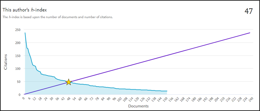 SCOPUS는 특정 연구자의 H-index 정보를 제공한다. 여기서 잠깐, H-index란 학자의 누적 연구 성과에 대한 종합적 평가 지표(인용 횟수 및 논문 개수 이용)로 학계에서 학자의 상대평가에 암묵적으로 활용되고 있는 지표이다. H-index의 단점은 공동 저자의 수, 저자 순서, 자기 인용, 인용 정도가 반영되지 않는다는 것이다.