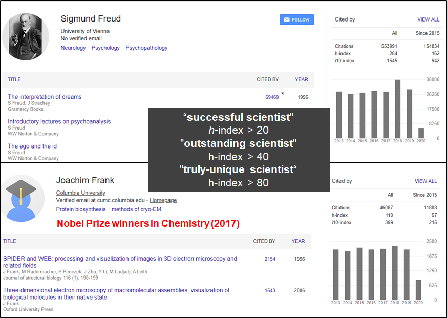 여담으로 H-index를 기준으로 성공적인(successful), 뛰어난(outstanding), 매우 훌륭한(truly-unique) 과학자를 구분하는데 기준은 아래 사진에 명시되어 있다. 2017년에 화학 분야에서 노벨상을 수상한 Joachim Frank의 H-index는 무려 100 이상이다.