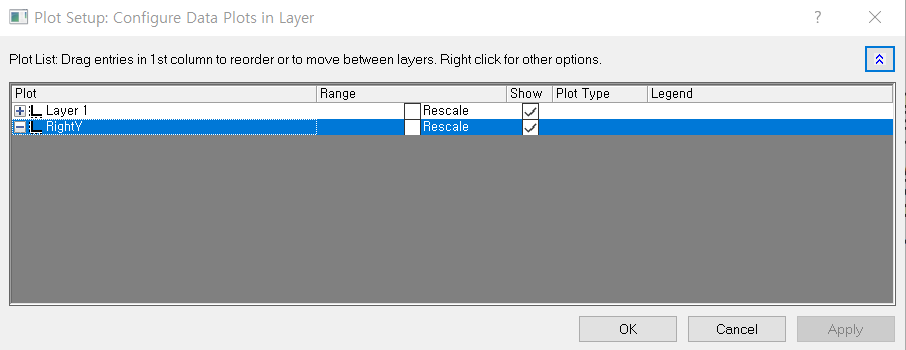 아래와 같은 창이 뜨는데 Layer 1은 기존의 y축, RightY는 새로 추가한 y축을 의미합니다.