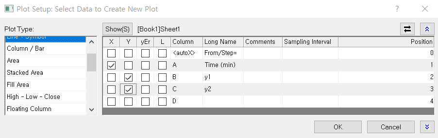 x값에 해당하는 데이터에 x를 체크하고 y값 2개는 y를 체크합니다.