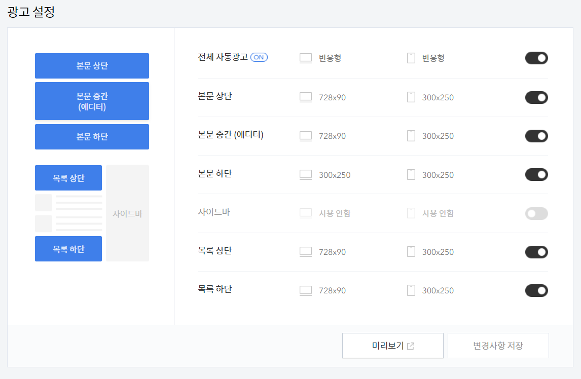 저는 데스크톱은 얇고 긴 광고가 좋아 "728 x 90"으로 주로 설정했습니다.